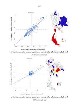 รูปที่ 15.8 Moran's I (ซ้าย) และ Local Spatial Autocorrelation (ขวา) ในการเลือกตั้ง ส.ส. แบบบัญชีรายชื่อปี